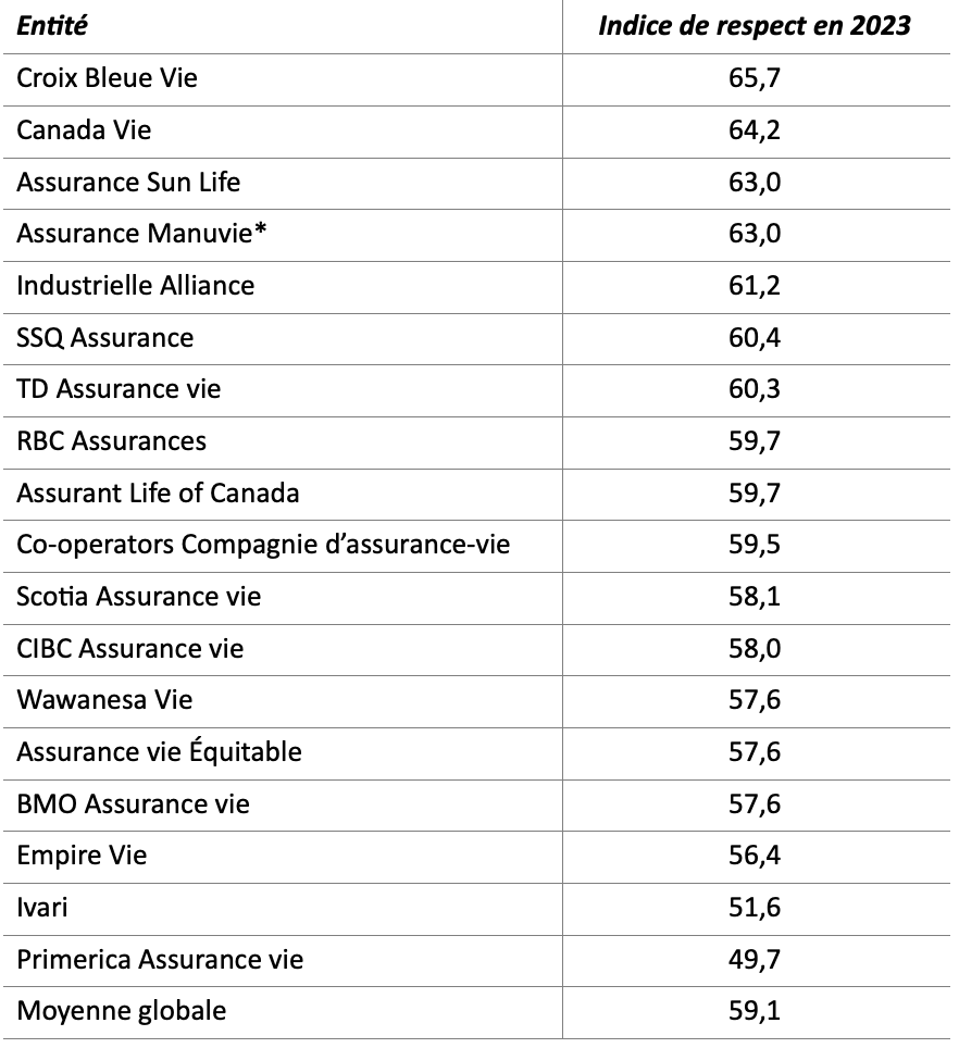 Le public canadien a choisi Croix Bleue Vie, Canada Vie et Sun Life à titre de compagnies d’assurance vie les plus respectées au Canada, en leur accordant les INDICES DE RESPECT les plus élevés dans le cadre d’un sondage national réalisé auprès de 2 981 adultes canadiens sélectionnés au hasard qui sont membres du panel en ligne de Maru/Blue, pendant la période du 13 au 24 avril 2023. Les résultats ont été calculés selon la méthodologie de classement mentionnée précédemment. Les tableaux présentant les résultats détaillés de cette étude sont accessibles ici.