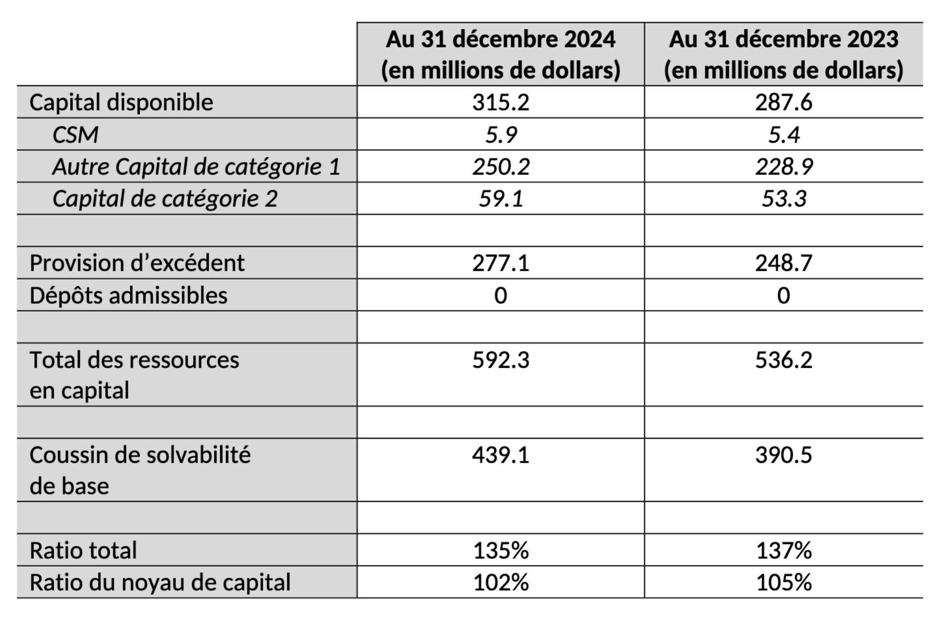 Au 31 décembre 2024, le ratio du TSAV total de Croix Bleue Vie s’établissait à 135 %, ce qui est largement supérieur au ratio total cible de surveillance et à la cible interne de Croix Bleue Vie. Le tableau ci-dessous présente une ventilation de ce ratio de solvabilité par composante, ainsi que les données de l’année précédente à des fins de comparaison.